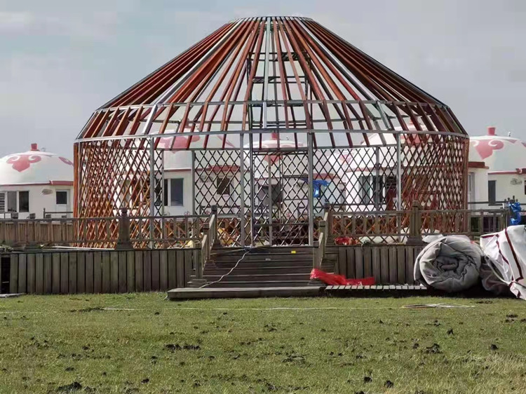 隨著時(shí)代的發(fā)展蒙古包逐漸的被商業(yè)化,比如蒙古包餐飲,蒙古包燒烤,蒙古包農(nóng)家樂等,都可以很好的體現(xiàn)我們鑫鋒受到很多商業(yè)人士喜好。豪華蒙古包工藝上采用蒙古包骨架全部木質(zhì)結(jié)構(gòu),附有雕刻工藝,堅(jiān)固耐用,拆裝靈活,外形美觀大方,防寒套采用純毛毛氈和丙綸防雨套用維綸有機(jī)硅高級(jí)防水帆布制作,不但具有防腐、防雨性能,而且對(duì)骨架和防寒氈具有保護(hù)作用,產(chǎn)品既保留傳統(tǒng)民族文化特色,又具有時(shí)尚因素。